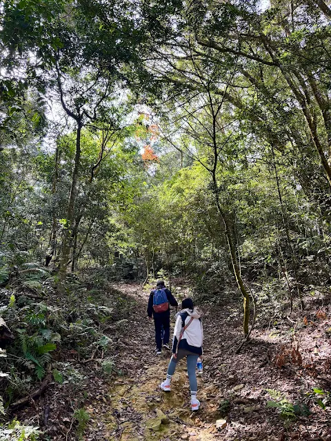 大腳山貓沙溪林道挑戰成功,停車整裝出發繼續前進尾寮山。「東登山口」0K標高1153公尺,步道全程樹林中上行林道舊路寬敞,緩緩爬升非常舒適好走,真可謂是「散步」上尾寮山,非常輕鬆愜意。